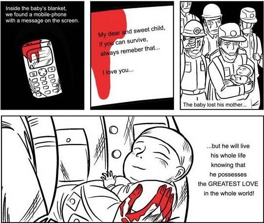 Aku terfikir sejenak, seorang ibu di China sanggup mengorbankan diri untuk melindungi bayi dari kandungannya sendiri untuk melihat bayi nya terus hidup. Tapi mengapa di negara kita, bayi dibunuh dan dibuang dengan tanpa rasa bersalah dan kasihan sedikitpun demi kepentingan diri sendiri. Pikirlah sejenak……